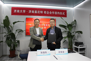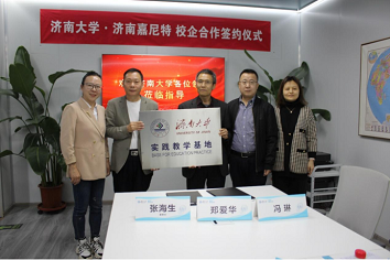 济南嘉尼特公司董事长张海生介绍了嘉尼特二十多年的发展历程和企业的面临的机遇和挑战,简要介绍了合作协议内容。双方对协议内容进行了友好协商。徐锡金、张海生代表双方签署了本科实践教学基地协议,并为基地揭牌。郑爱华、张海生代表双方签署了校企合作共建专业战略协议。