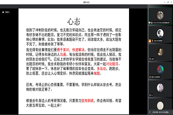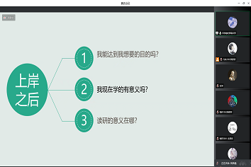 为了帮助大三、大四同学们认清考研与就业的形势,早日确立人生方向,尽快走出因临近毕业而出现的迷茫状态,必赢76net线路官网心理生涯服务中心于11月5日在线上通过腾讯会议召开了“剑指研峰”考研经验交流会,听取往届优秀考研生的经验介绍和方法指导,为有考研准备的同学提供经验借鉴。