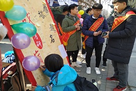 寒风渐渐,热情不减。中午十一点,志愿者们将帐篷、桌椅等活动所需器材搬至八食广场并摆放整齐,为活动的开展做足了准备。本次活动中志愿者们的热情服务和辛勤付出,也展示出必赢官网学子昂扬的精神风貌。同学们在八食广场积极宣传,许多来往的学生都在展板上留下了自己对学长学姐的祝福,很多考研学子深深感受到了本次活动带来的温暖,在横幅上留下来自己的名字。期间,必赢官网青协组织了街头采访,通过路过的学生拍摄了助力考研视频,并给路过的考研学长学姐赠送了带有考研祝福语的明信片。
