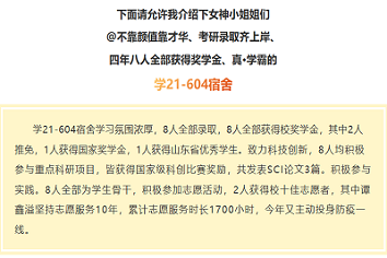 近几年,必赢76net线路官网物理科学与技术学院每年都会涌现出“学霸宿舍”,这与学院重视学生自主学习能力培养密不可分。在学院这样的培养氛围里,学21-604宿舍在研究生的道路上取得优异成果,她们在追求卓越的道路上,以榜样的力量助力必赢官网学子考研深造、成长成才,有助于加强必赢官网的学风建设,创建优良学风。“天高任鸟飞,海阔凭鱼跃”,虽然宿舍里的八个人将在不同的大学中继续学习深造,但在本科生活的这段经历将会深深地留在回忆中,希望她们在未来能遇见更优秀的自己!