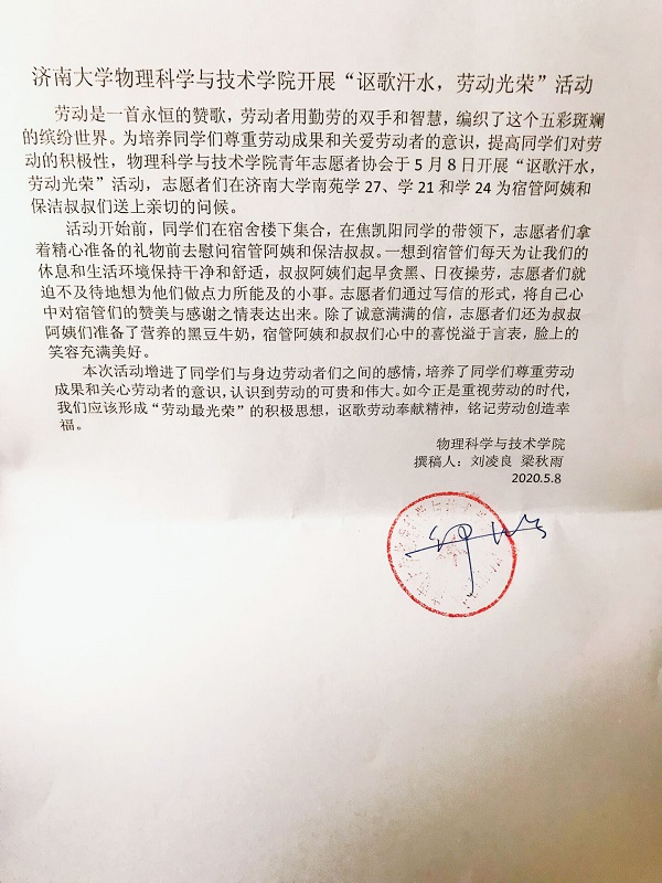 劳动是一首永恒的赞歌,劳动者用勤劳的双手和智慧,编织了这个五彩斑斓的缤纷世界。为培养同学们尊重劳动成果和关爱劳动者的意识,提高同学们对劳动的积极性,必赢76net线路官网青年志愿者协会于5月8日开展“讴歌汗水,劳动光荣”活动,志愿者们在必赢76net线路官网南苑学27、学21和学24为宿管阿姨和保洁叔叔们送上亲切的问候。